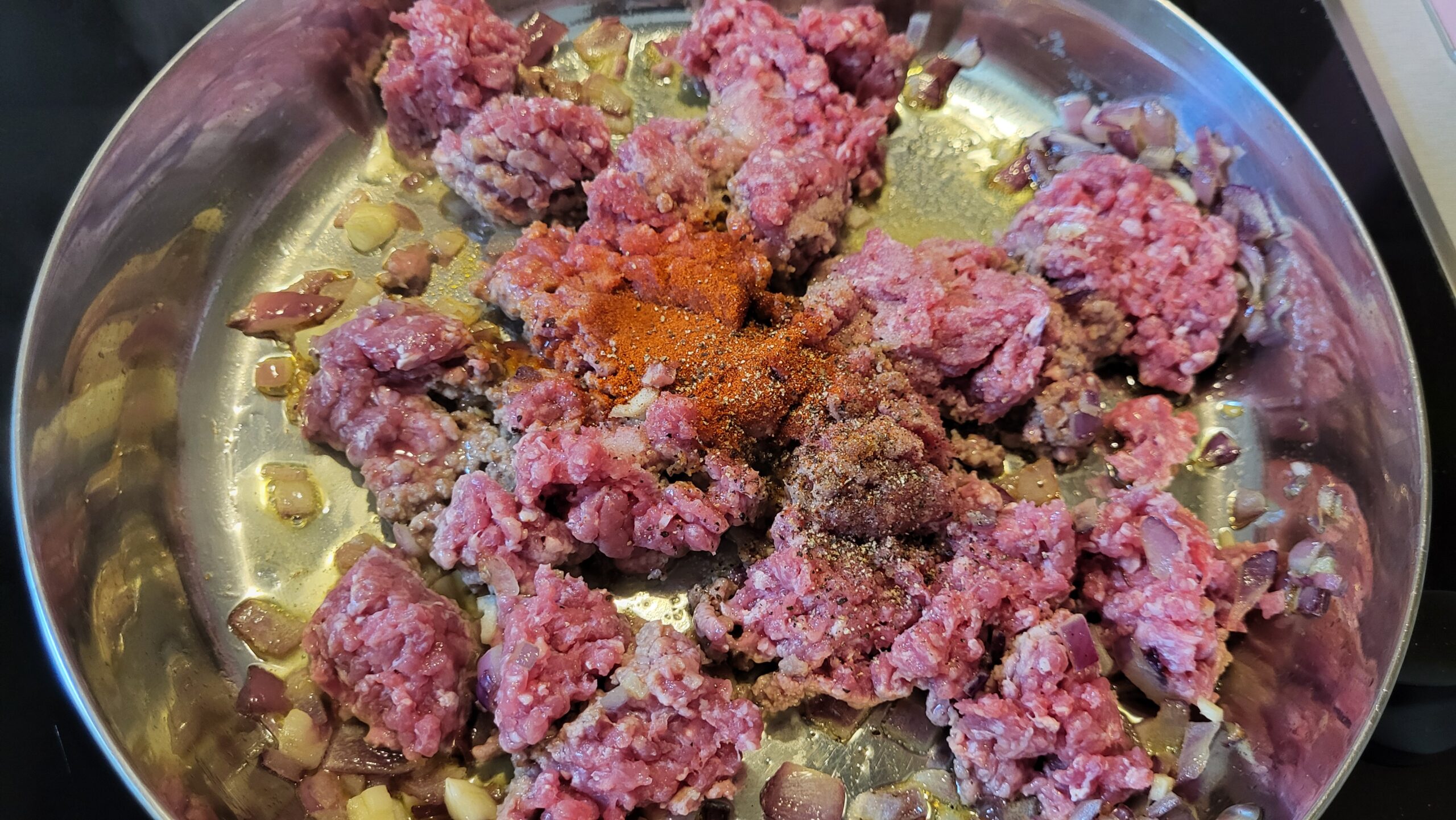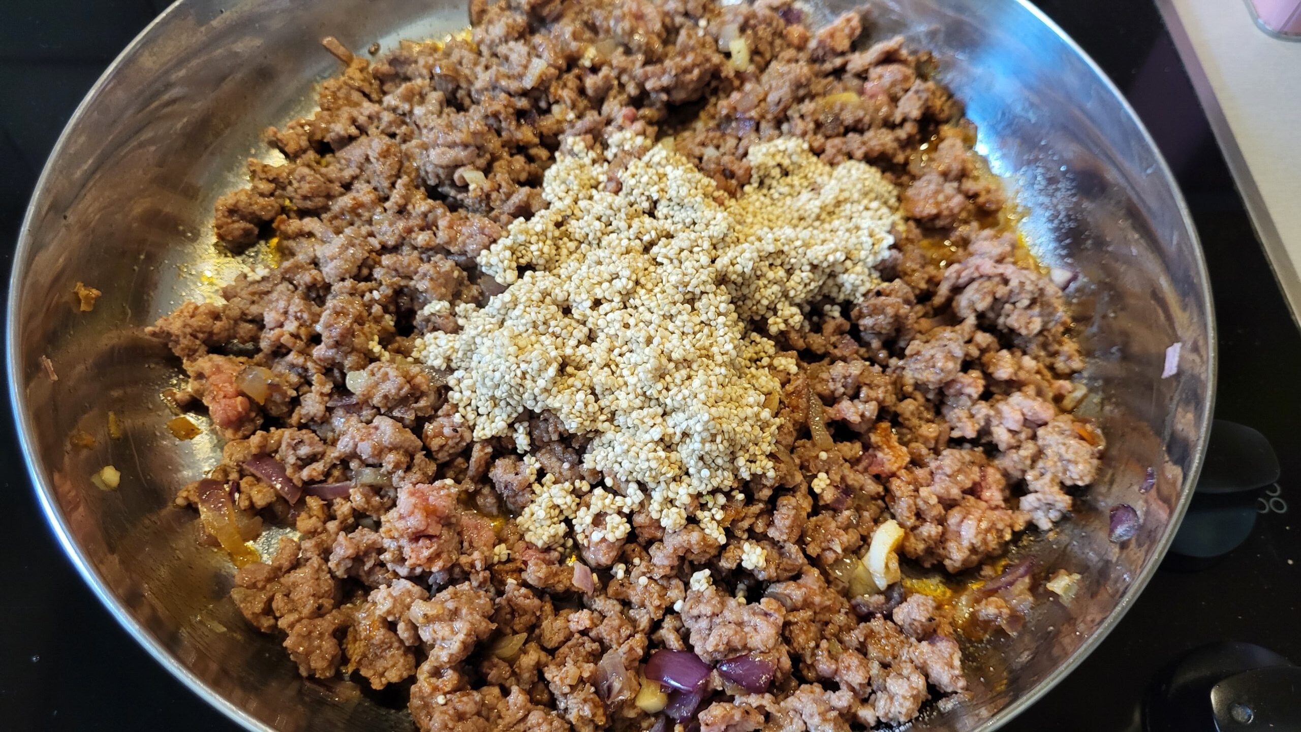 Na maslinovom ulju prodinstati crni luk dok ne postane staklast, dodati beli luk, kratko propržiti, zatim dodati mleveno meso. Dinstati dok meso ne promeni boju. Na kraju dodati mlevenu papriku, so, biber i opranu kinou. Dobro promešati.