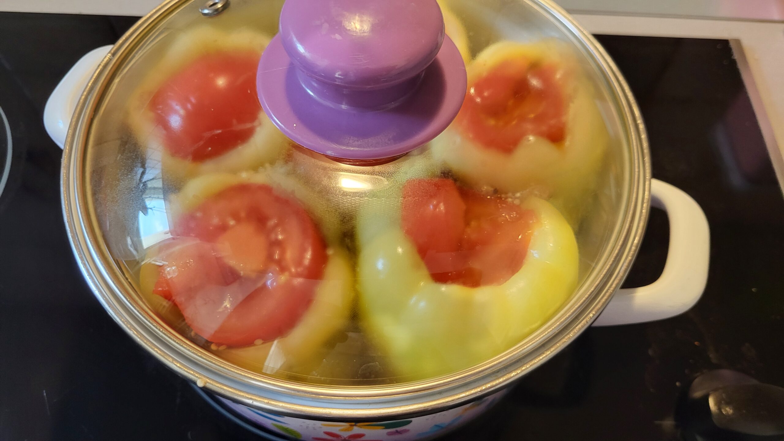 Dodati oko 0,5l vode u šerpu i kuvati na srednjoj temperaturi oko 30 minuta. Zagrejati rernu na 200C i zapeći paprike, gotove su nakon 15 minuta.