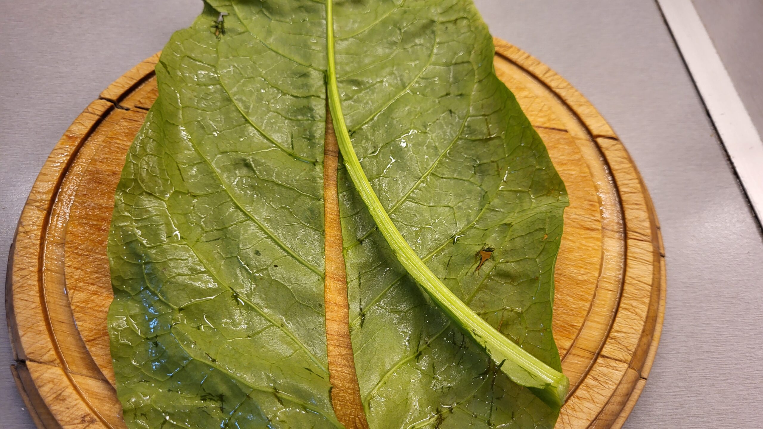Listove zelja operite. Deblje žile na dnu listova pažljivo istanjite ili uklonite nožem, kako bi se sarmice lakše motale.