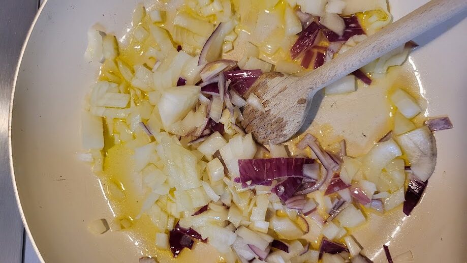 U većem tiganju zagrejte maslinovo ulje. Dodajte sitno seckan crni luk i dinstajte ga na umerenoj vatri dok ne postane staklast i mekan, oko 5-7 minuta.
