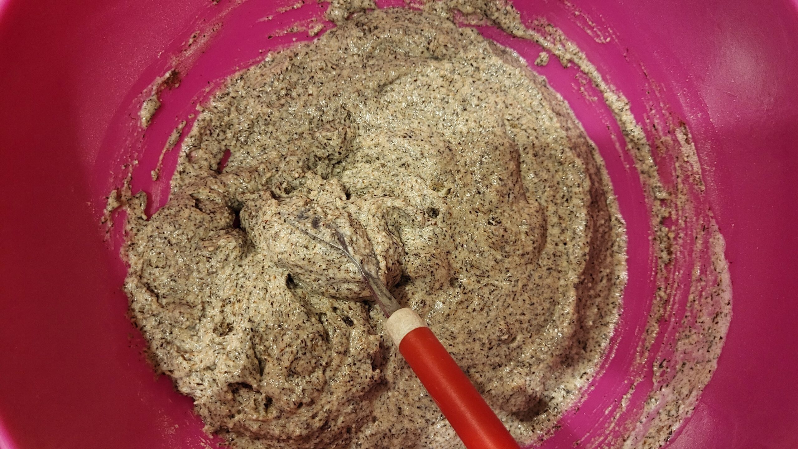 Postepeno dodajte heljdino brašno pomešano sa praškom za pecivo, uz stalno mešanje. Trebalo bi da dobijete gustu, ali ne previše čvrstu smesu (kao za guste palačinke).